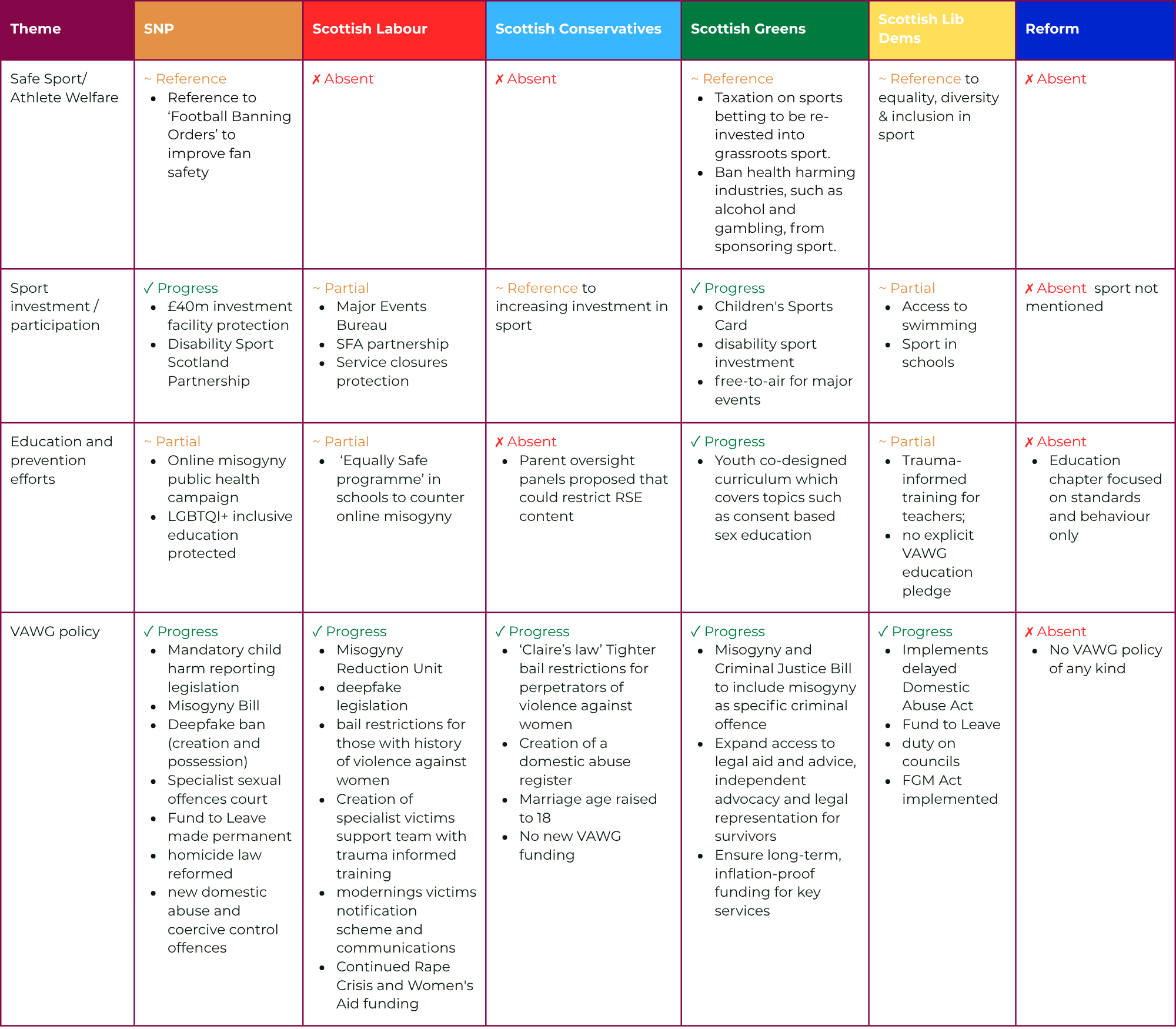 The table below offers a snapshot across six parties and four themes we consider central to safer sport. We chose these themes because they reflect the areas where policy decisions at Holyrood level can make a tangible difference: whether athletes are protected, whether communities have access to sport, whether young people receive education that helps prevent harm, and whether violence against women and girls is taken seriously as both a societal and a sport-specific issue. Following the table, we discuss five key themes that cut across the parties and point to where the real gaps lie.