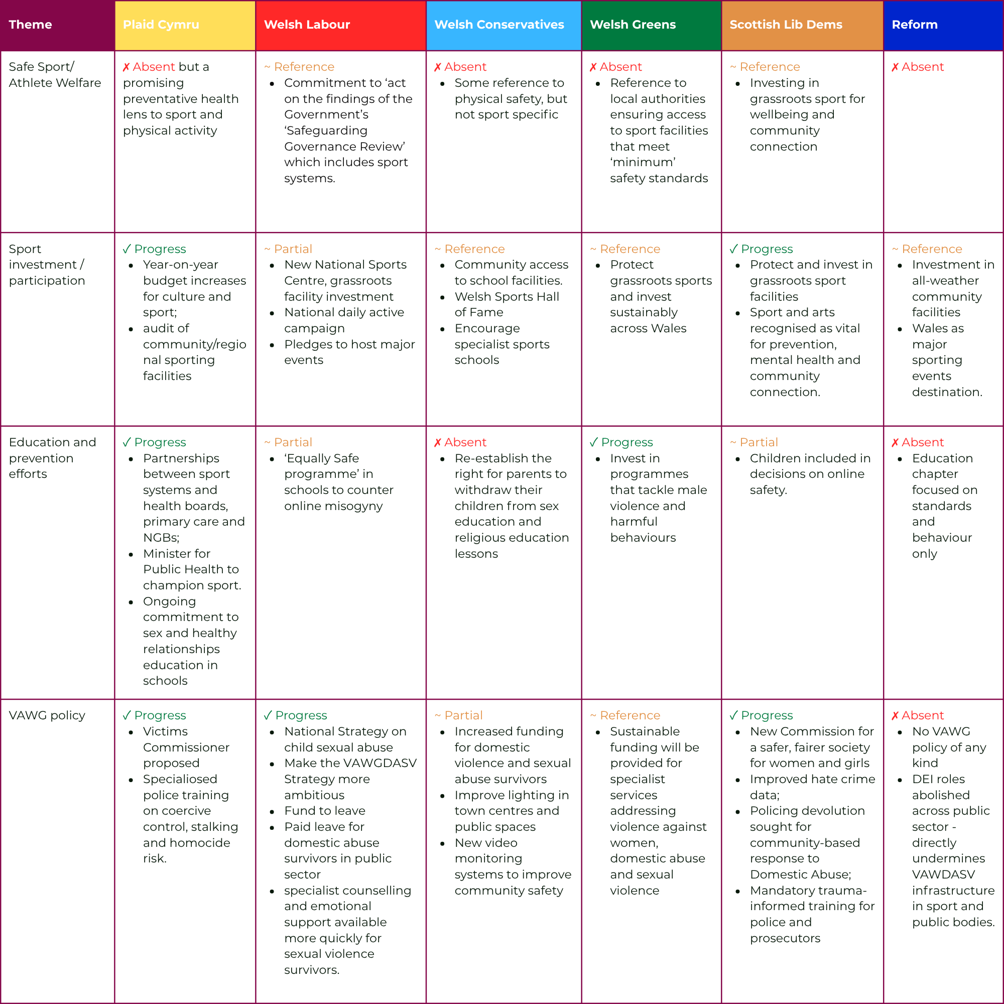 The table below offers a snapshot across six parties and four themes we consider central to safer sport. We chose these themes because they reflect the areas where policy decisions at the Senedd level can make a tangible difference: whether athletes are protected, whether communities have access to sport, whether young people receive education that helps prevent harm, and whether violence against women and girls is taken seriously as both a societal and a sport-specific issue. Following the table, we discuss four key themes that cut across the parties and point to where the real gaps lie.